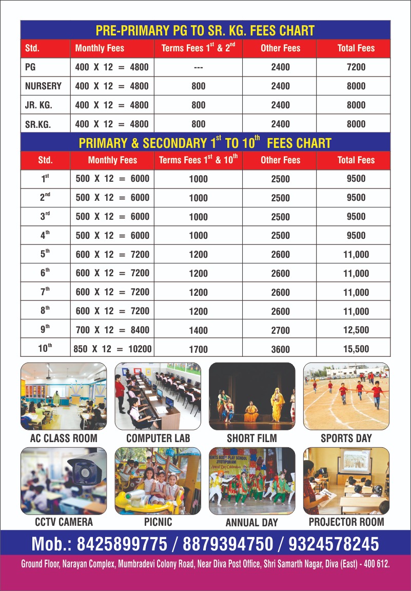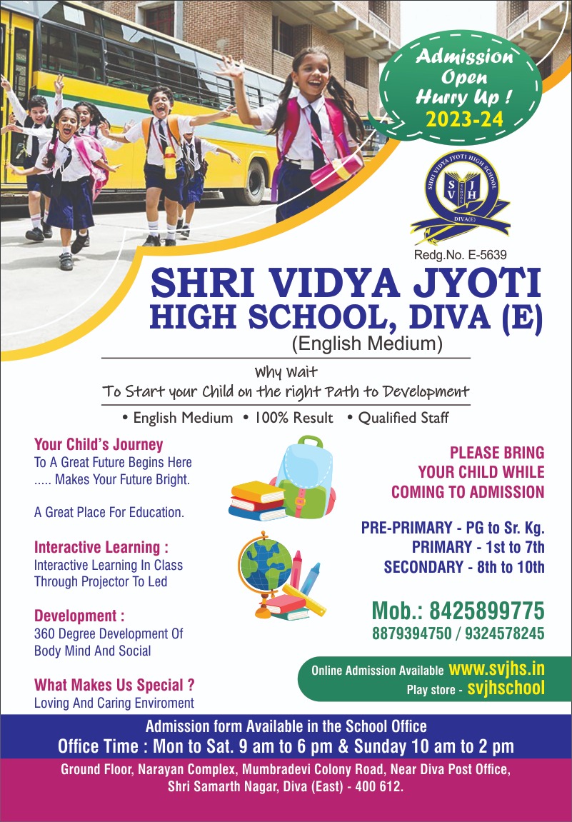 The name of My School Shri Vidya Jyoti High School .English Medium Maharashtra Setat Bord It’s not very far from my house. It is situated in Diva , near the railway station . I have been reading there since my childhood. Nearly Sevan hundred students read here. The number of teachers at present is sixteen & Principal Madam Sunita D. Jadhav Two Clark Eight Sweepers . The school building is quite commodious with Ten Room in Ground floors. The number of students in each class is between Thirty to Forty . The au...